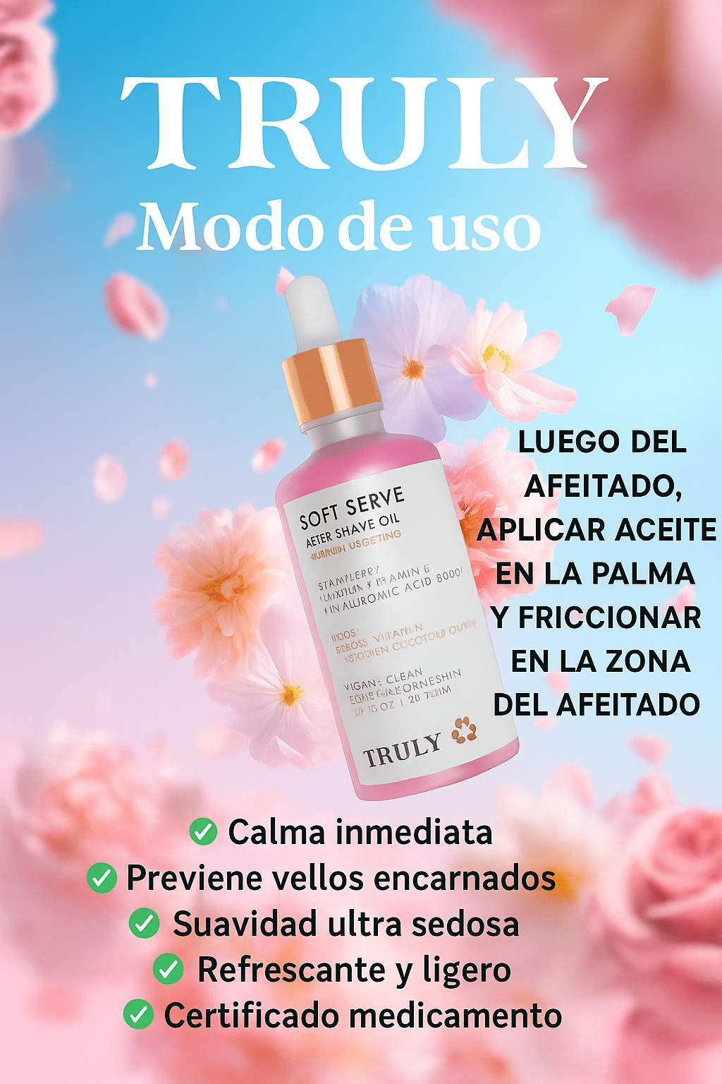 Truly Aftershave Oil es un tratamiento íntimo profesional, diseñado para calmar al instante, hidratar profundamente y evitar los vellos encarnados